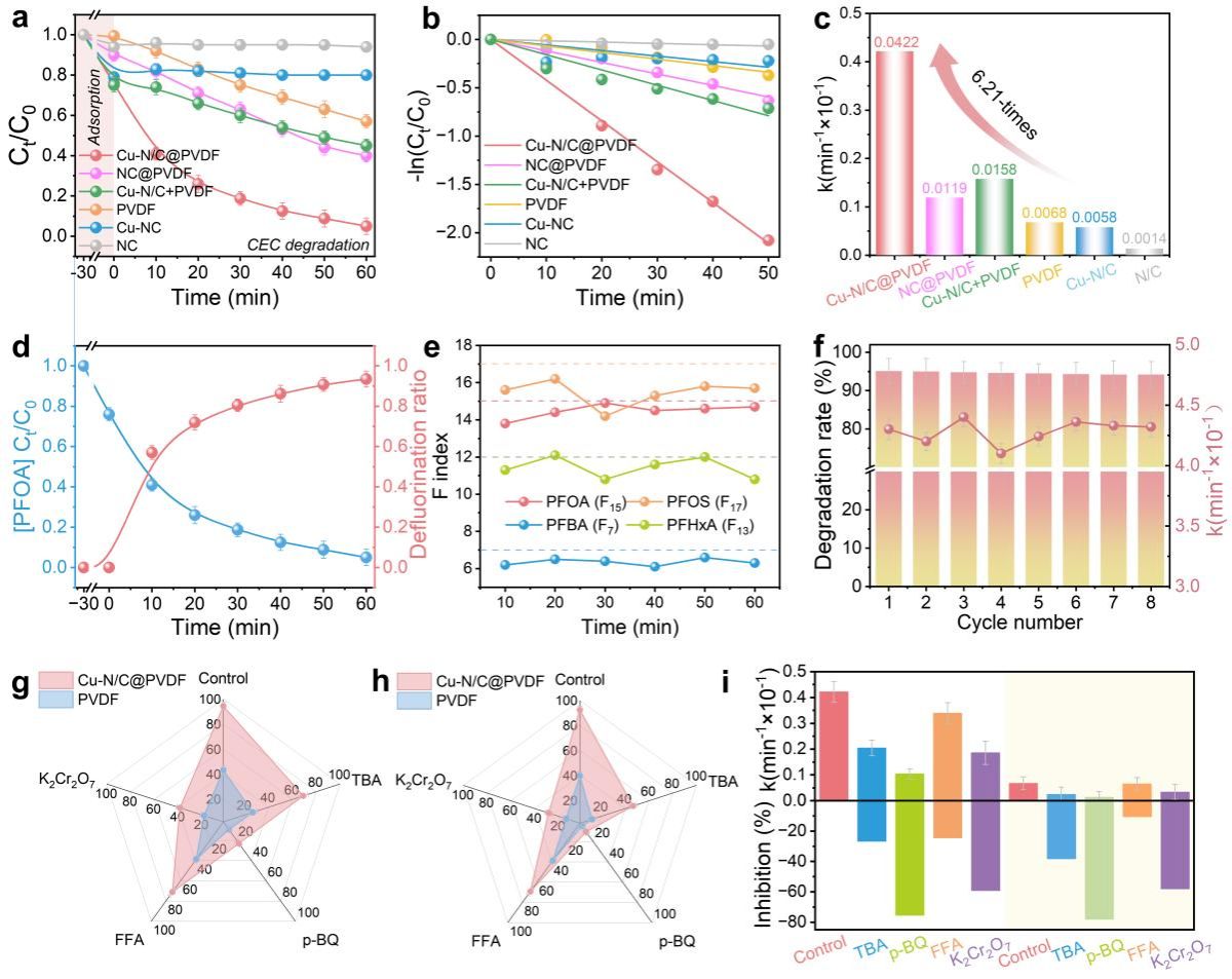 研究发现,通过在聚偏氟乙烯(PVDF)基质中嵌入原子级分散的Cu-N4位点,能够触发界面电子转移并诱导PVDF的β相结晶,从而显著增强压电极化和界面电场(IEFs)。这种独特的配置通过场发射效应驱动电子从PVDF基质定向注入Cu-N4活性中心。富电子的铜位点能够活化溶解氧生成•O2−,通过亲核攻击诱导C-F键极化并断裂。随后,系统产生的•OH和1O2协同作用,将低氟中间体彻底氧化矿化,构建了高效的级联还原-氧化路径。