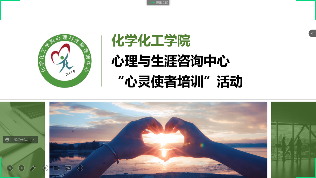 晚上7点,全体成员准时进入线上会议室,活动正式开始。主持人简述了活动的基本流程,并强调了相关注意事项。主持人首先播放了两个心理知识的小短片,学生对如何解决心理困惑有了初步的了解。然后,孙晓爽老师从大学生心理发展特点、常见的心理问题、如何培养健康心理、校内寻求心理咨询的方法途径等四个方面为与会人员进行全面讲解,最后针对心灵使者的工作职能做了进一步的阐述,孙老师强调心灵使者首先要保证自己的身心健康,然后才能充分了解班级同学的心理健康状况及波动情况,及时与班主任、辅导员老师反馈信息,做好学生与老师之间的桥梁纽带。随后,中心负责人乔帅超对心理与生涯咨询中心进行了简短的介绍,讲述了中心与心灵使者的关系,心灵使者是班级开展心理活动的组织者和实施者,也是心理困惑学生的朋辈引导者。活动的最后,2020级优秀心灵使者代表石菲菲向同学们分享自己一年来工作经验,使同学们更加清晰地认识到心灵使者的责任与担当。