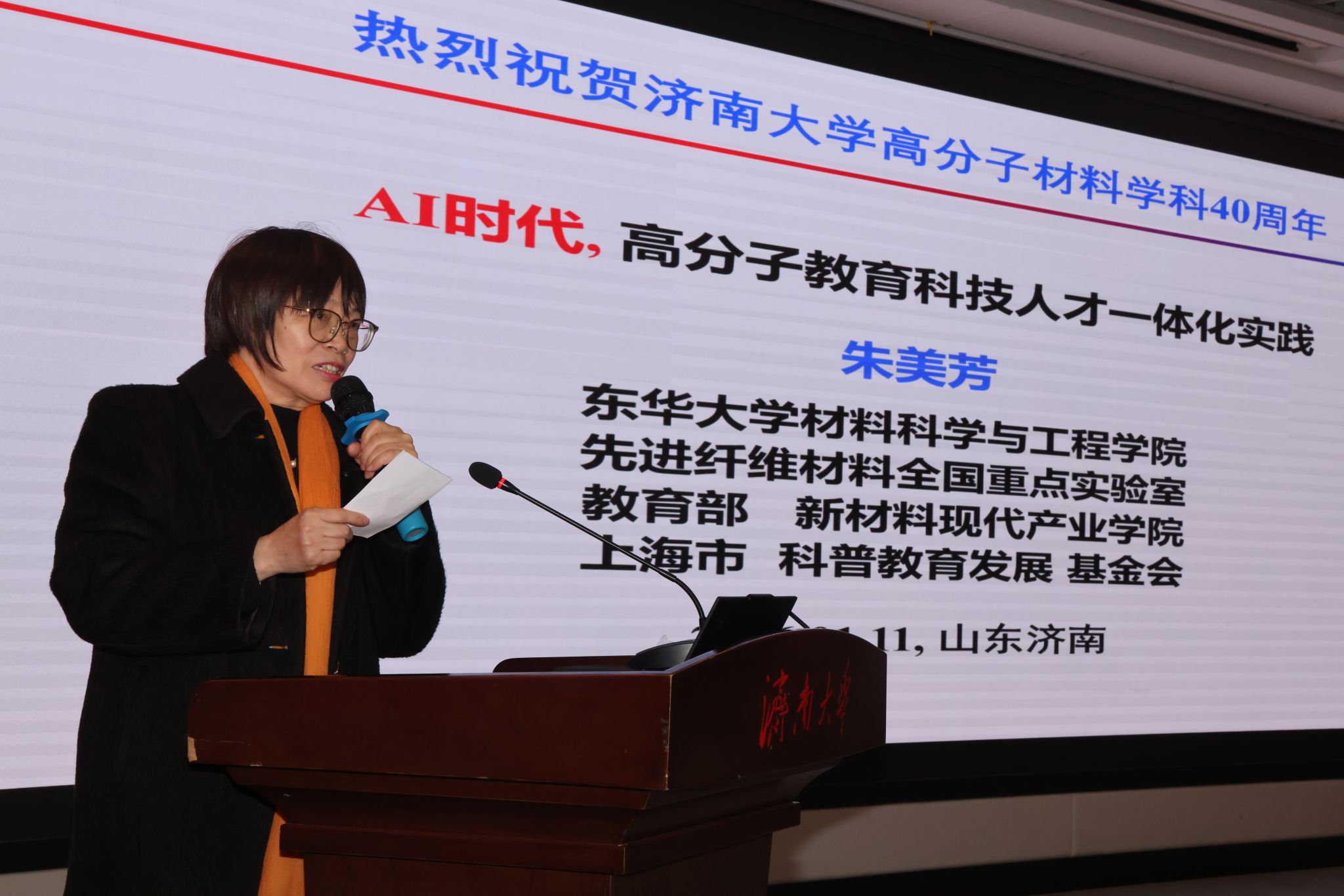 教师代表山东省教学名师周春华教授深情分享四十年从教感悟,她说学生的成长是教师最大的骄傲,并对校友们的倾情反哺表示欣慰,期望在学校领导、校友及企业各界支持下,高分子材料与工程专业越来越好。