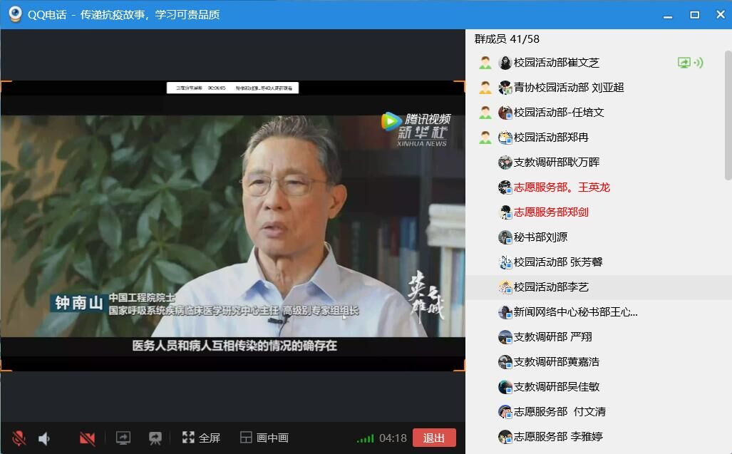在抗击新型冠状病毒肺炎这场无声的战役之中,涌现出一大批勇毅的英雄,他们主动出击,甘当疫情防控“守门员”。为了深入了解抗疫英雄们的感人事迹,从中学习他们冲锋在前,不惧艰险的精神,奥门新浦京官网心连心爱心社于4月5日晚在线上举办了传递“抗疫故事,学习可贵品质”主题活动,心连心爱心社部分成员参加了本次活动。