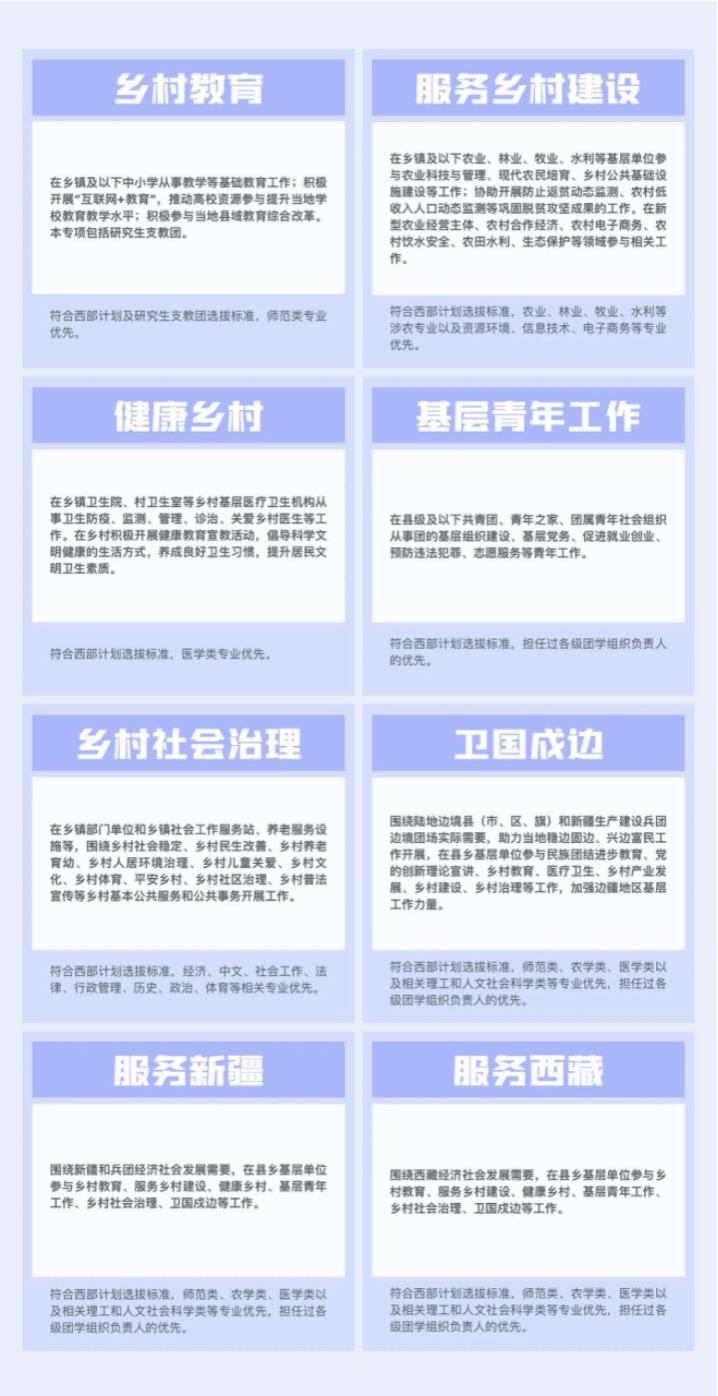 西部计划设乡村教育、服务乡村建设、健康乡村、基层青年工作、乡村社会治理、卫国戍边、服务新疆、服务西藏等8个专项,90%以上服务岗位设置在乡镇及以下。西部计划志愿者服务期为1至3年,服务协议一年一签。为激励志愿者服务期满继续扎根基层,国家在升学、就业、培训培养等多个方面给予政策支持。