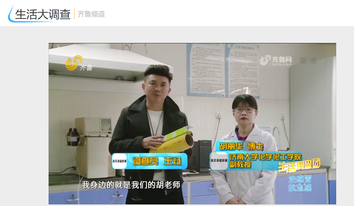 胡丽华老师参与录制了2021年4月28日山东广播电视台齐鲁频道播出的“《生活大调查》:保鲜膜过热会致癌?”节目。在节目中,胡老师向观众们现场演示了聚氯乙烯(PVC)、聚乙烯(PE)和聚偏二氯乙烯(PVDC)三种材质的保鲜膜的燃烧实验,分析了实验现象,并给观众朋友们提出了一些保鲜膜的使用建议。